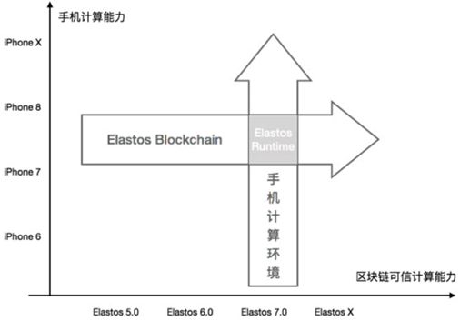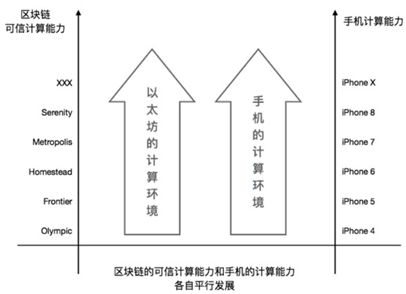 陈榕和韩锋注意到,区块链系统的可信计算能力在持续提高,人们的手机计算能力也在提高,可惜两者却是平行发展。无论多少用户手里的手机多么强大,也帮不上以太坊分担计算,而无论以太坊升级多少次,也无法为用户手机的计算环境提供信用保障(见下图)。